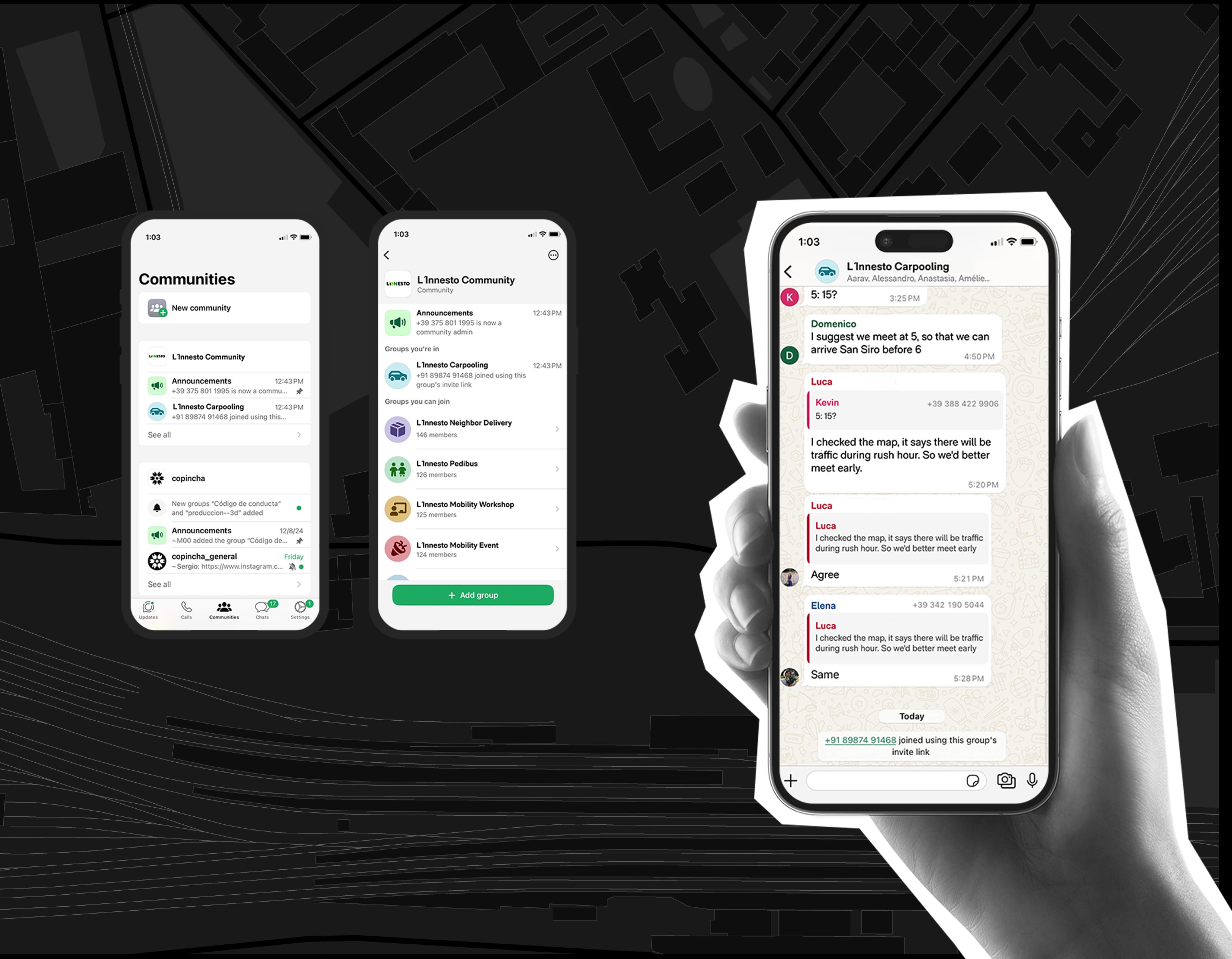Launch the L’Innesto WhatsApp Community—led by trained volunteer admins—with groups for carpooling, neighbor delivery, pedibus, workshops, and events to streamline communication and drive sustainable mobility among residents.